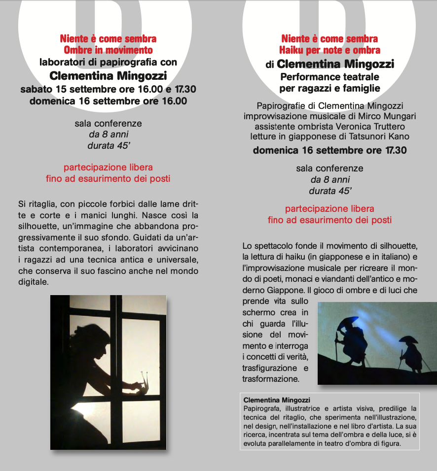 The occasion of the Philosophy Festival on the theme of Truth provided the perfect opportunity for the combined realization of a workshop with the viewing of a shadow puppet theater show dedicated to Japanese Haiku poetry. It was a pleasure to engage participants, guiding them to act and observe the difference between action and outcome, technique and expression, narration and poetry.
